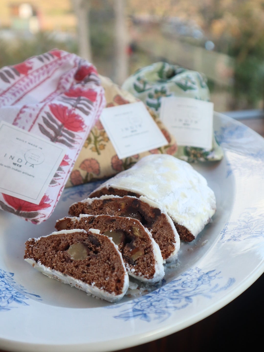 洋酒に漬け込んだドライフルーツ、ナッツをたっぷり練り込んだチョコのシュトーレン。小ぶりサイズです。